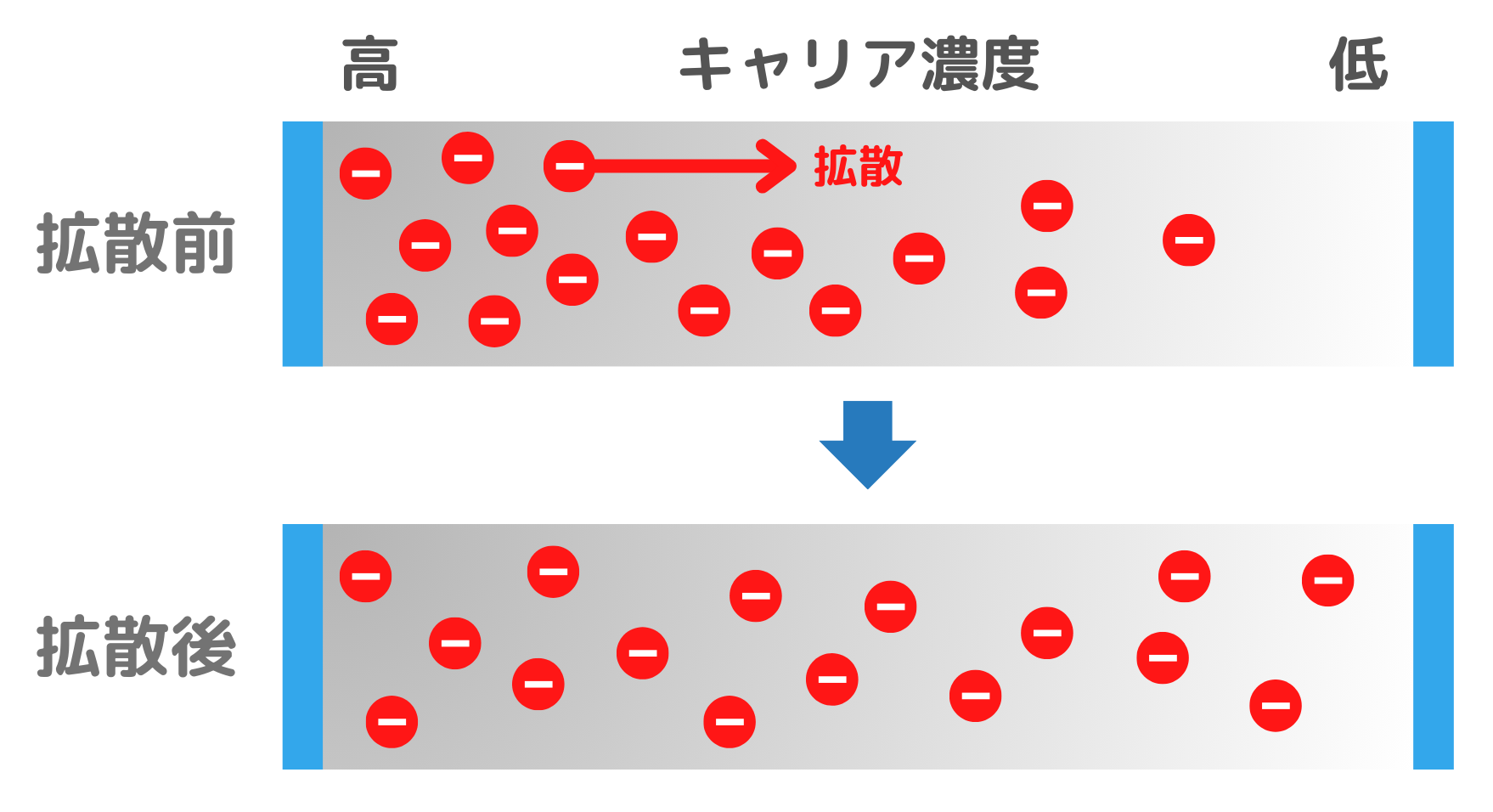 半導体材料にキャリア濃度差がある場合、濃度差が均一となるようにキャリアは拡散します。この拡散によって電流が発生するのです。