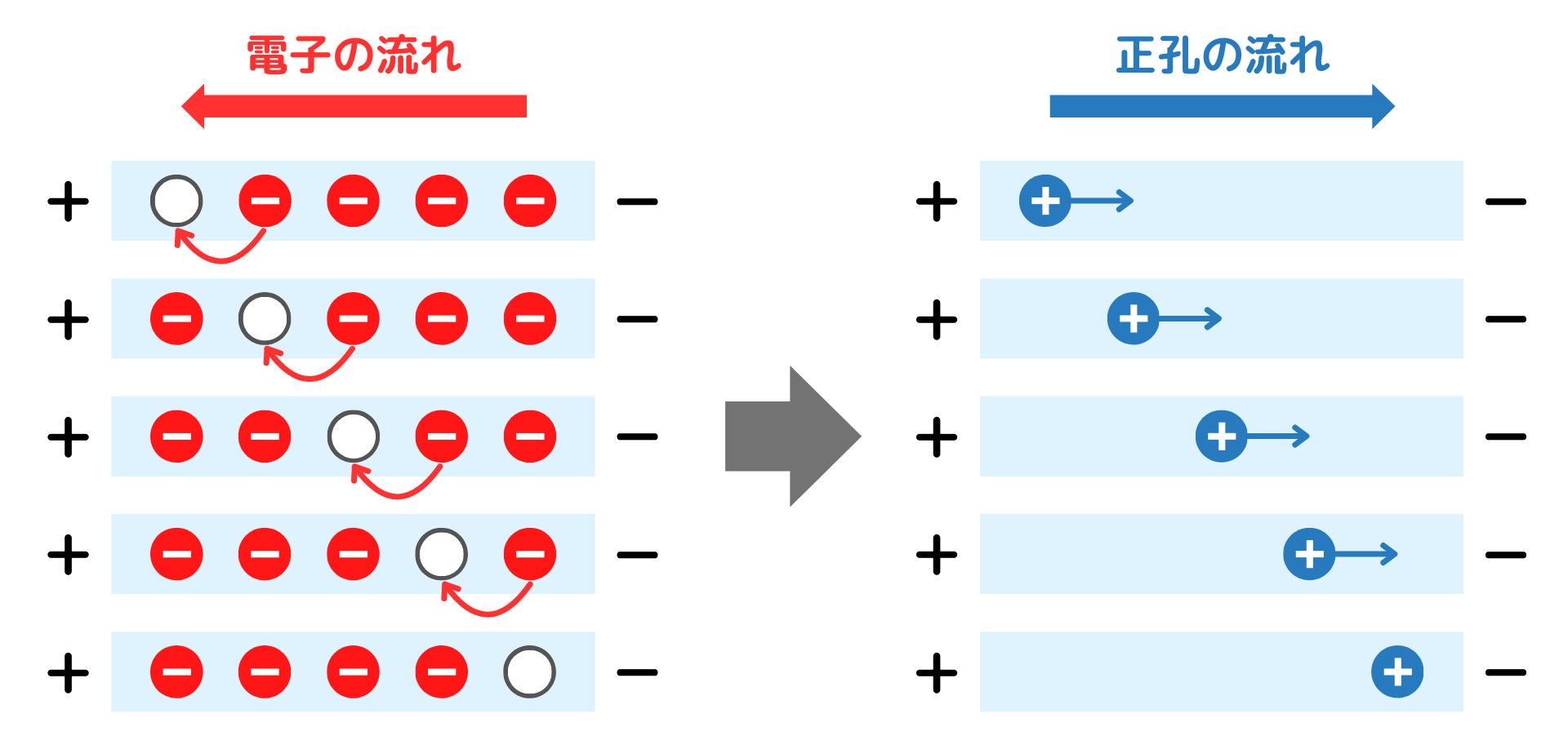 正孔の場合も同様に、p型半導体の価電子帯中の正孔は、n型半導体側には移動しにくくなります