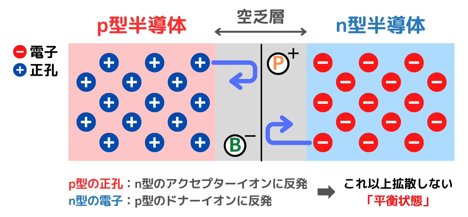 p型側では正孔が、n型側では電子が、空乏層に残ったイオンによる電界によって反発され、これ以上拡散できなくなります。この状態を「平衡状態」と呼びます。