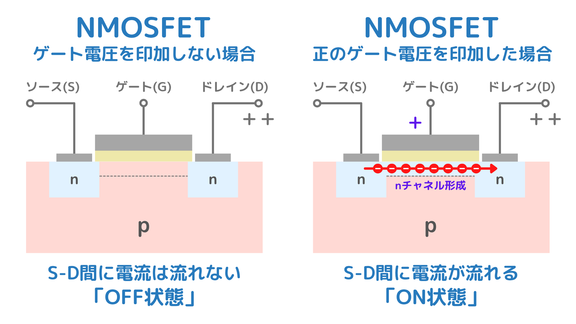 NMOSFETは、P型基板の中にN型の領域(ソース・ドレイン)が作られた構造をしています。ゲートに正の電圧をかけると、電子(マイナスの粒)が引き寄せられて「N型の道(反転層)」ができ、電流が流れます。