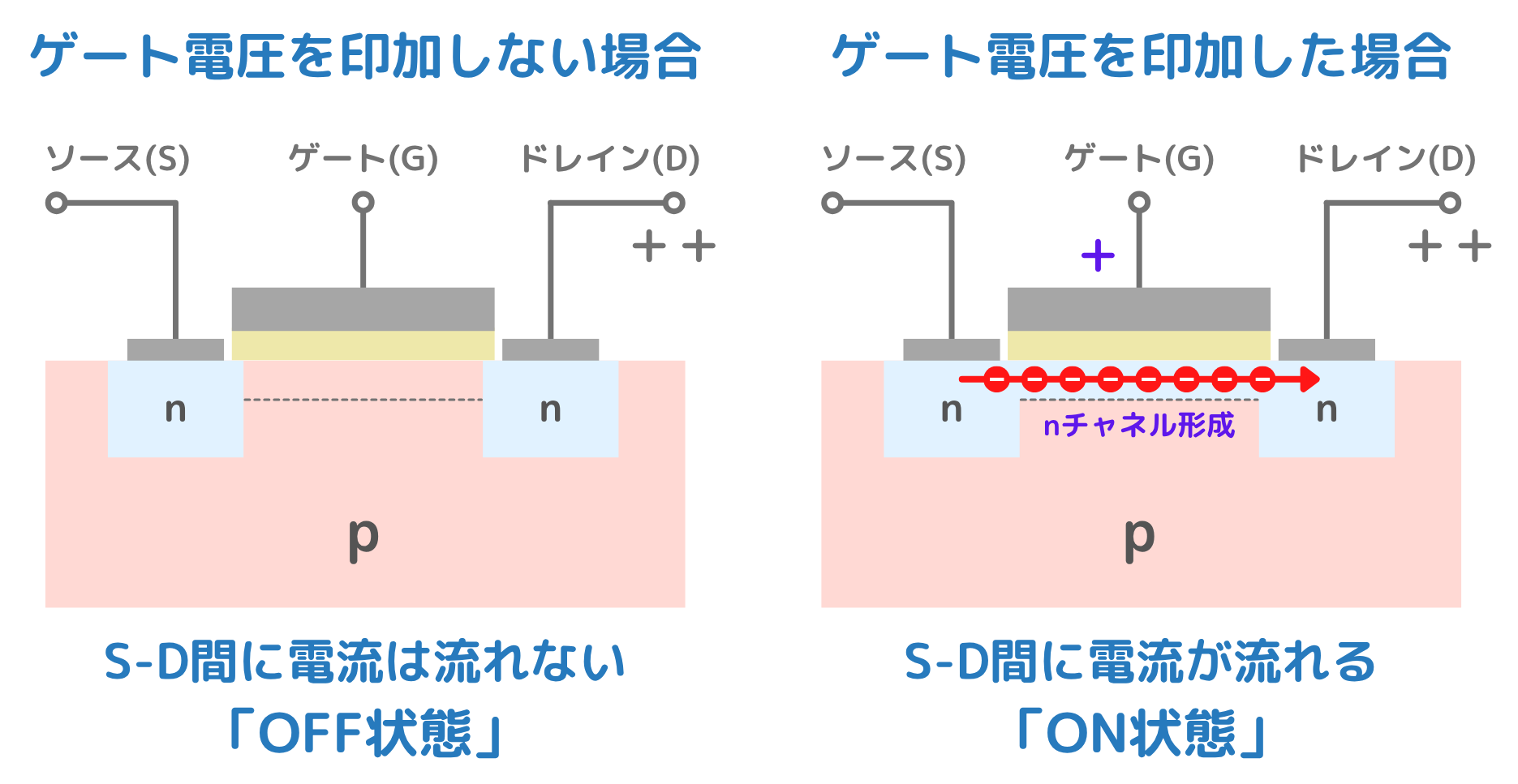 • チャネル(電流の通り道)が形成されず、電気が流れません。これがデジタル上の「0」に対応します。