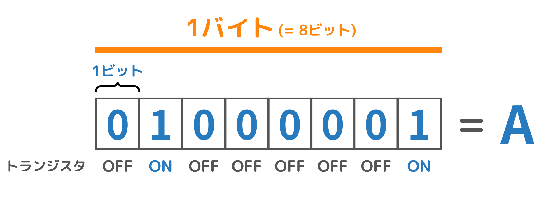 例えば、8個のトランジスタが並んでいる場合、0をOFF、1をONとして、それぞれのトランジスタの状態を「01000001」という並びに合わせて制御します。