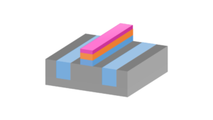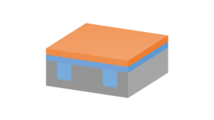 フォトリソグラフィーによる露光工程です。ソース・ドレイン領域の形成をイメージしています。