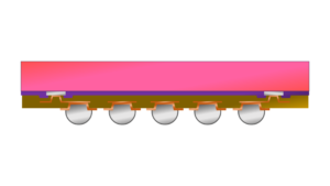 半導体パッケージ基板のイラストです。Siブリッジがパッケージ基板に埋め込まれています。